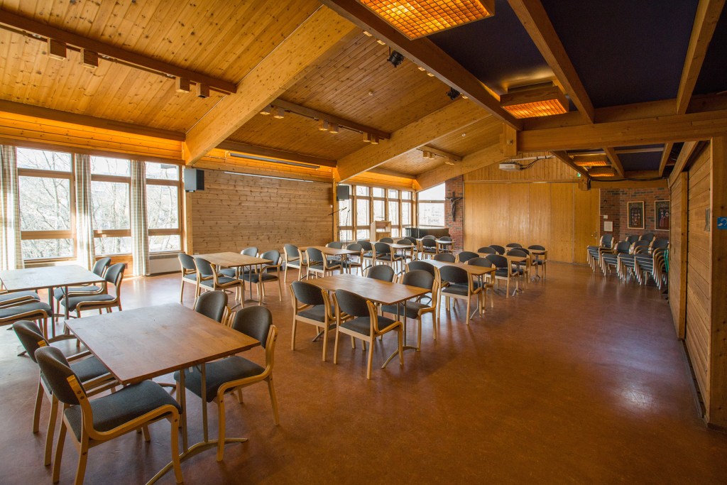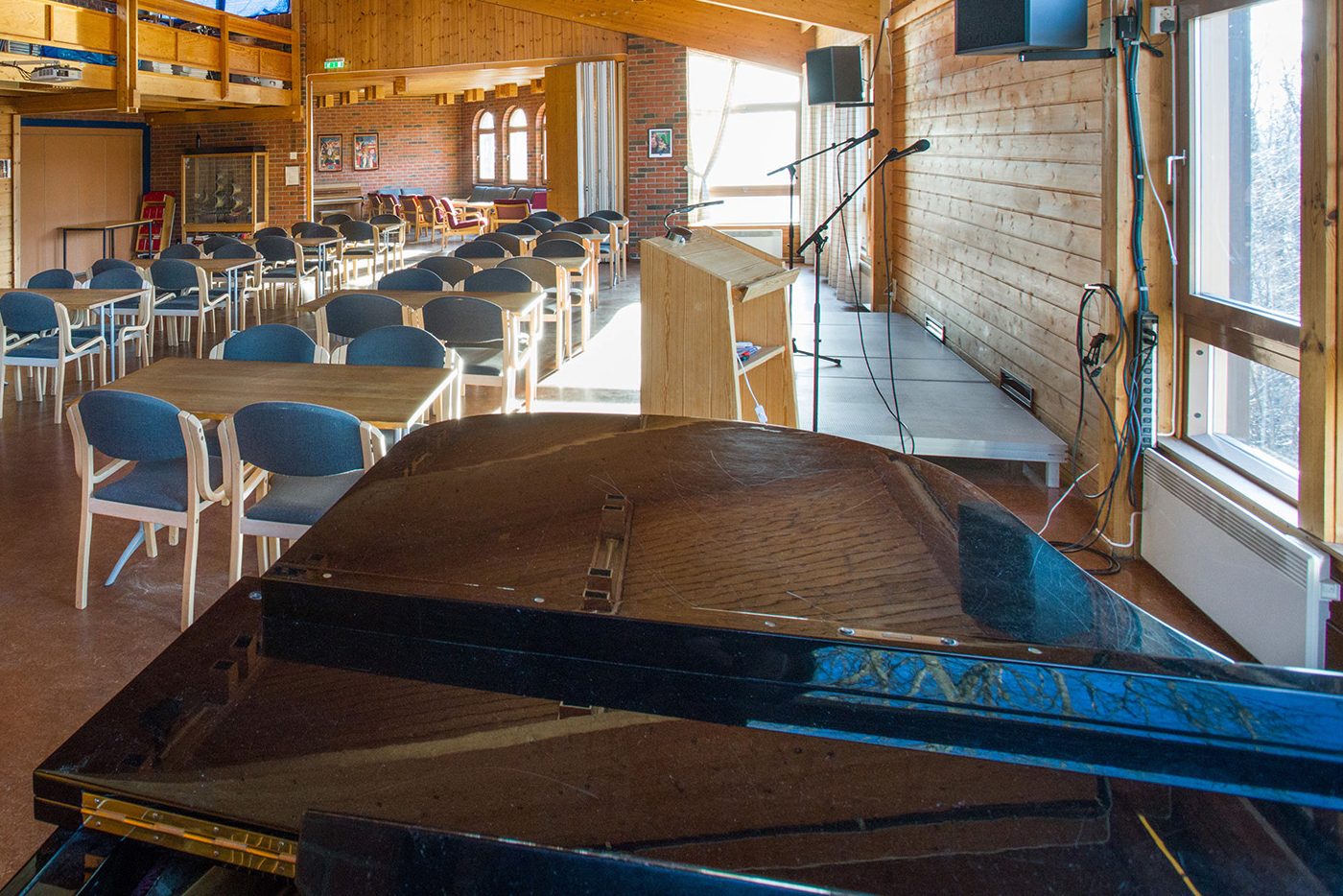 Hovedsalen er «hjertet» i menighetshuset. Salen er romslig (145 m2) og med god sitteplass til ca. 80 personer, ev. flere. Det er god takhøyde og god belysning både med naturlig dagslys og med lyspunkter i salen. Det er mulig å stable bort bord og bruke stoler i «kino-oppsett» og øke antallet til 150 personer.
