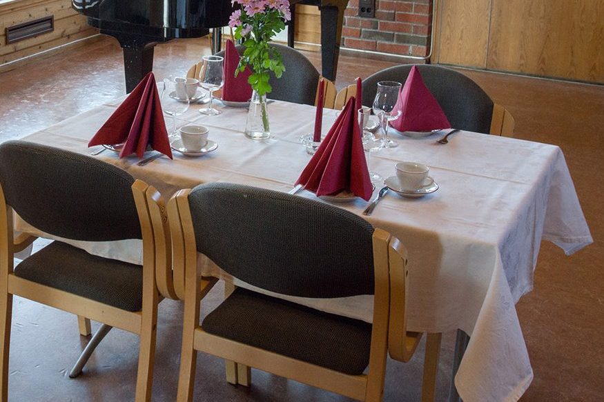 Det er mulig å leie hvite duker for pynte salen med oppdekning til fest.
